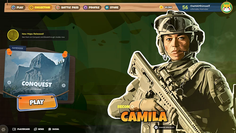 As part of an exploration in UI applications and theming, I took an opportunity to craft something that would likely never happen: morphing the visual tone of a serious game to a whimsical one. Battlefield 2042, set deep in an era of conflict and war, naturally takes a serious, technologically-advanced visual tone. I thought it would be an interesting challenge to convert the style of the UI to that of a Crash Bandicoot-esque one – because why not?