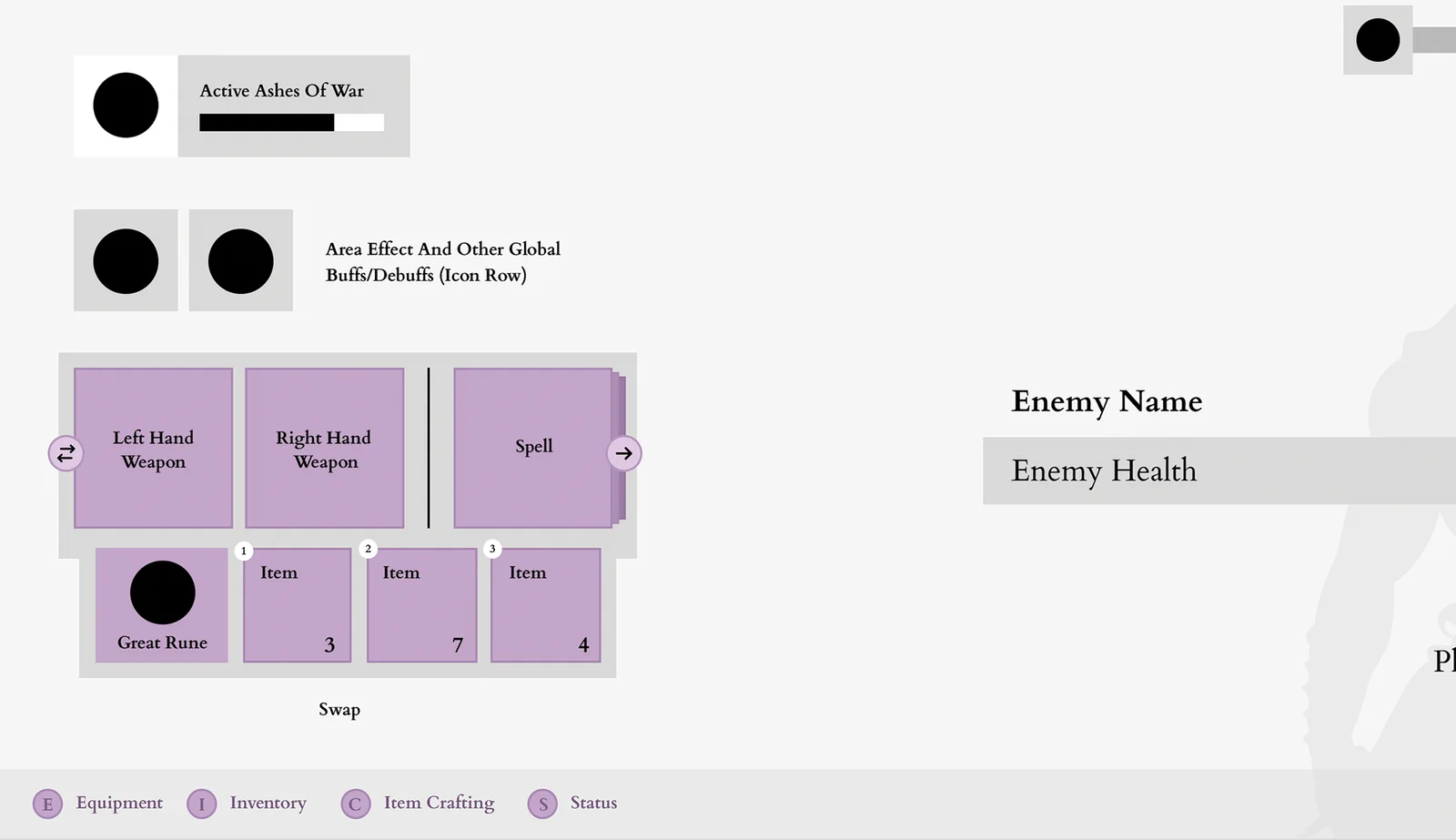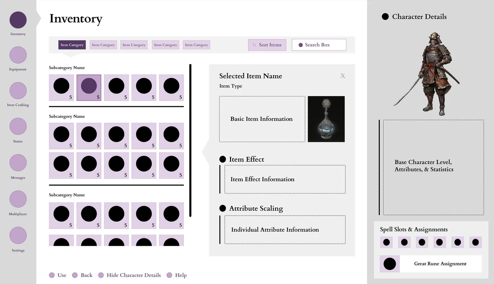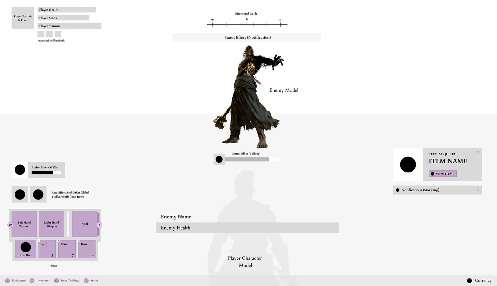 Elden Ring, as many believe, is a masterpiece of a game – while also being the challenge of a lifetime for most players. While participating in a course taught by Ivy Sang, the Director of UX/UI for Diablo IV at Blizzard Entertainment, I had the opportunity to step through a small portion of user research, player profile definition, wireframe creation, and ultimately my take on an evolved version of Elden Ring interface elements.
