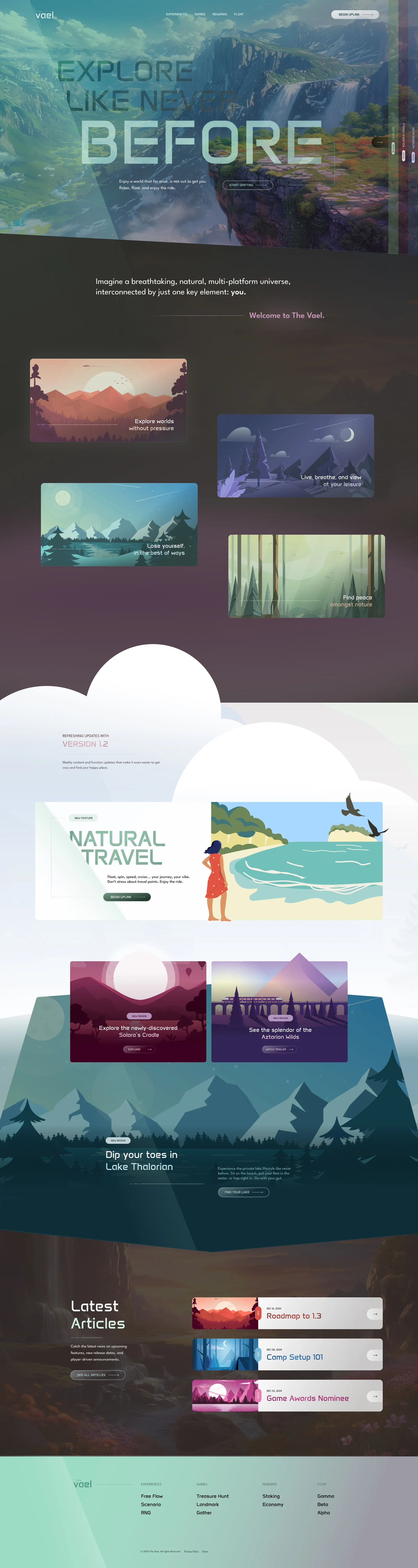 With the majority of my historical experience being in web, but my current focus being on gaming, I wanted to craft a case study that combined the two into a portrayal of vision and capability in terms of UI. This led to a fictional game world that allowed me that opportunity: The Vael. A world that allows for you to experience it, without being in combat, and without: finding peace, exploration, or simply a moment of still. What better way for me to build UI elements that would carry over into an in-game interface, while demonstrating story, flow, and general web understanding.